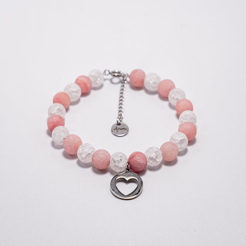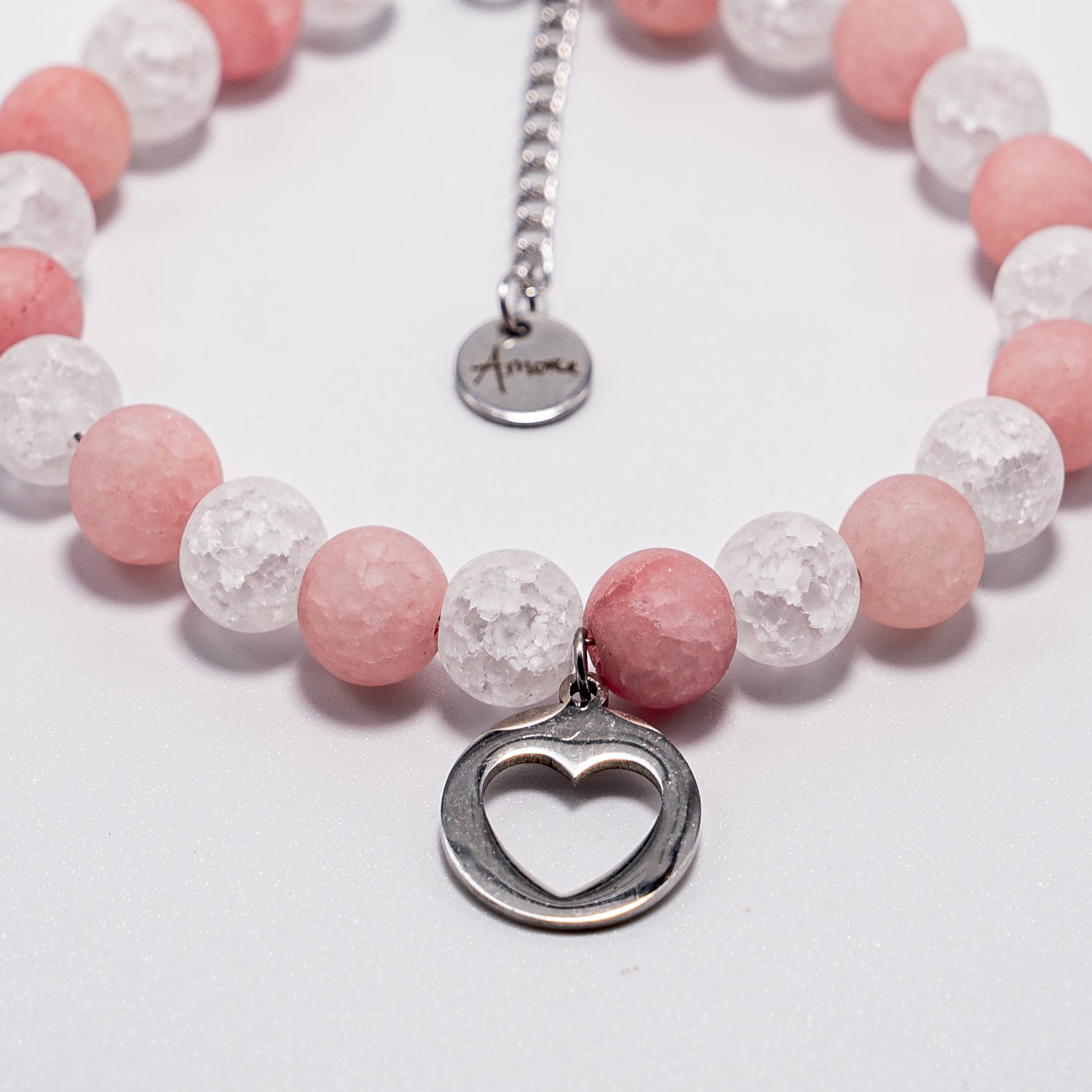 Zapestnica s kamnitimi perlami - ahat, gorski kamen. Ročno sestavljena zapestnica ima na koncu jekleno ketnico. Zato je primerna za skoraj vsa zapestja. Zaključek na verigi je jeklen obesek z gravuro A-more.