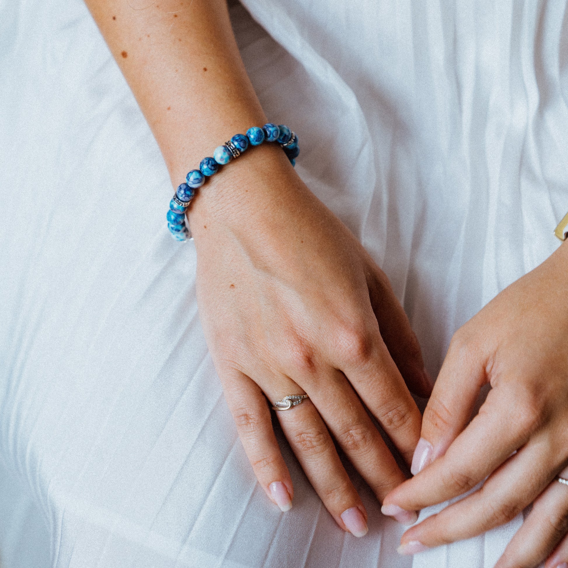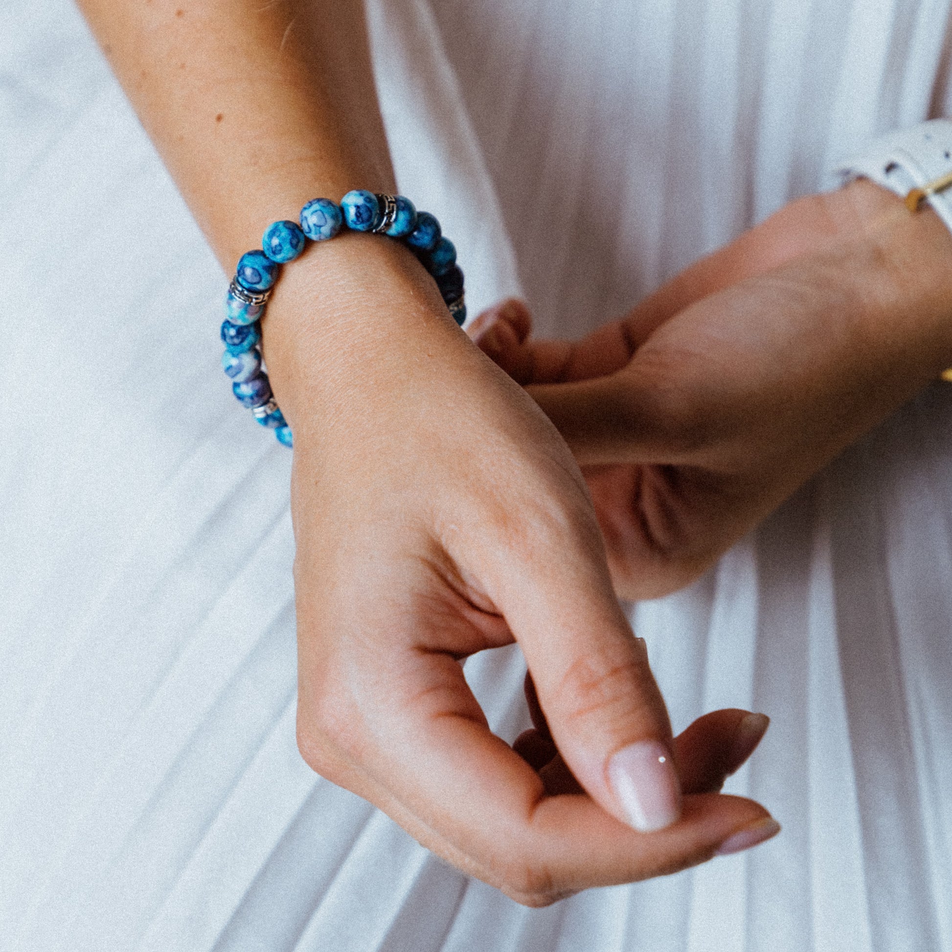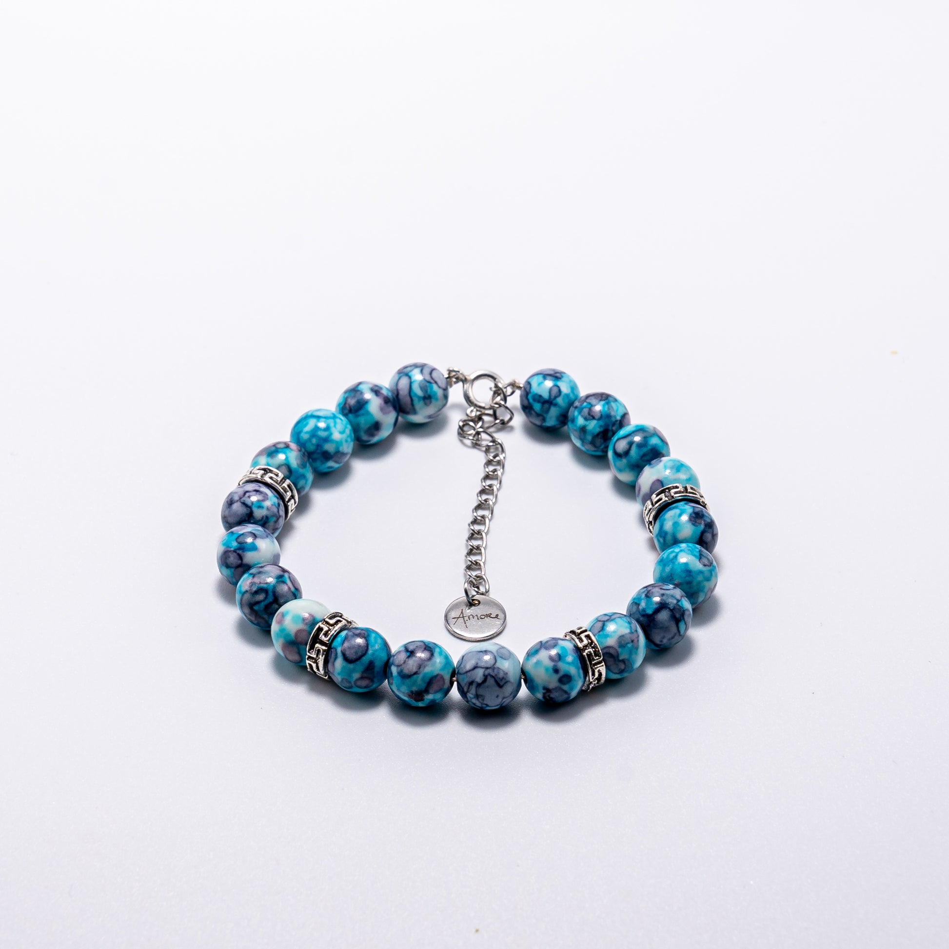 Zapestnica s kamnitimi perlami - jaspis. Ročno sestavljena zapestnica ima na koncu jekleno ketnico. Zato je primerna za skoraj vsa zapestja. Zaključek na verigi je jeklen obesek z gravuro A-more.