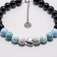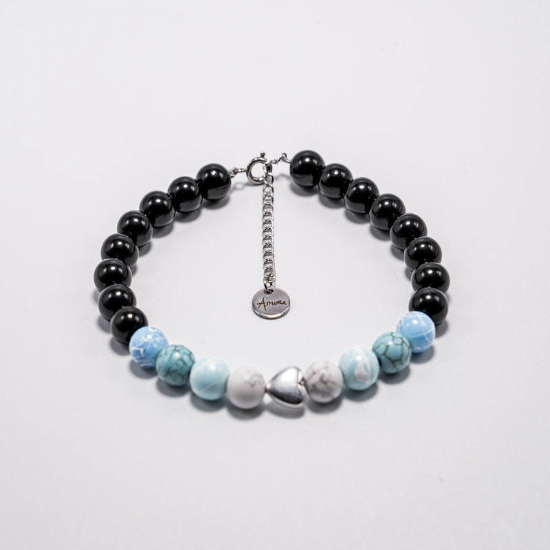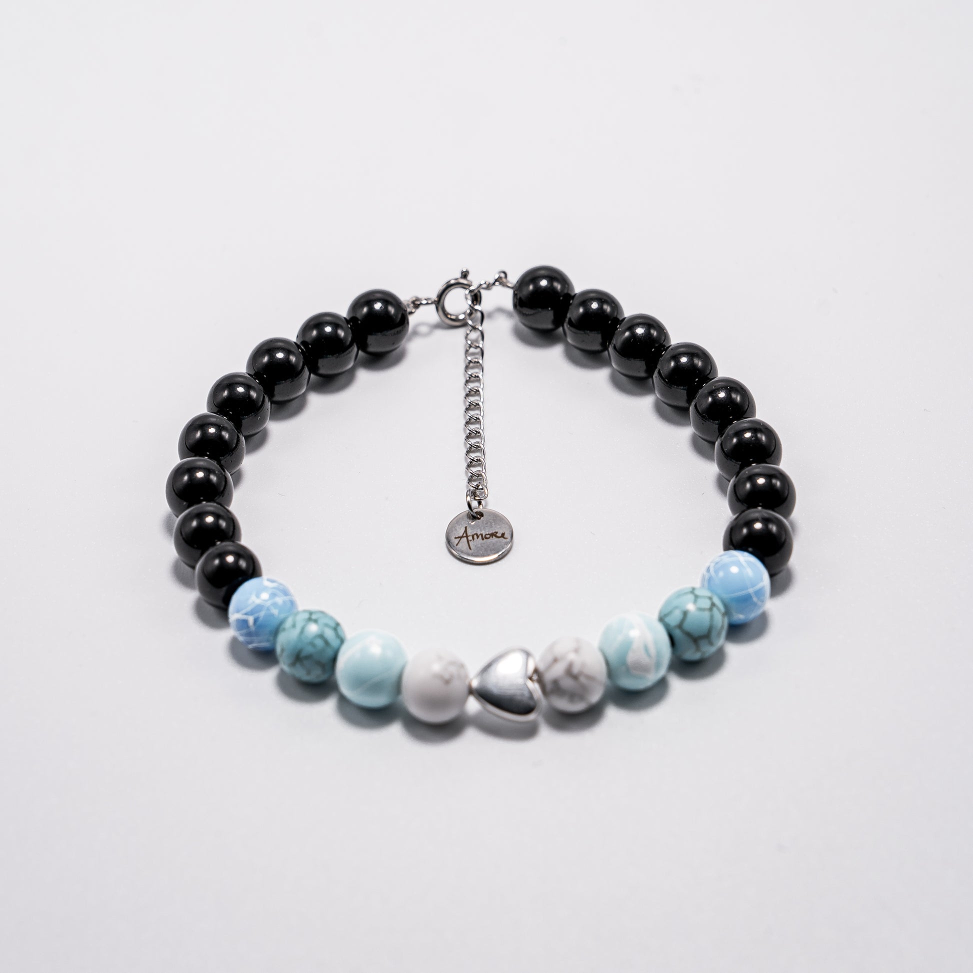 Zapestnica s kamnitimi perlami - haolit, steklo, oniks. Ročno sestavljena zapestnica ima na koncu jekleno ketnico. Zato je primerna za skoraj vsa zapestja. Zaključek na verigi je jeklen obesek z gravuro A-more