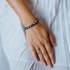 Zapestnica s kamnitimi perlami - jaspis. Ročno sestavljena zapestnica ima na koncu jekleno ketnico. Zato je primerna za skoraj vsa zapestja. Zaključek na verigi je jeklen obesek z gravuro A-more