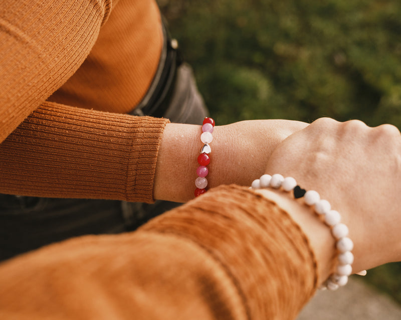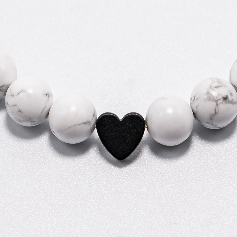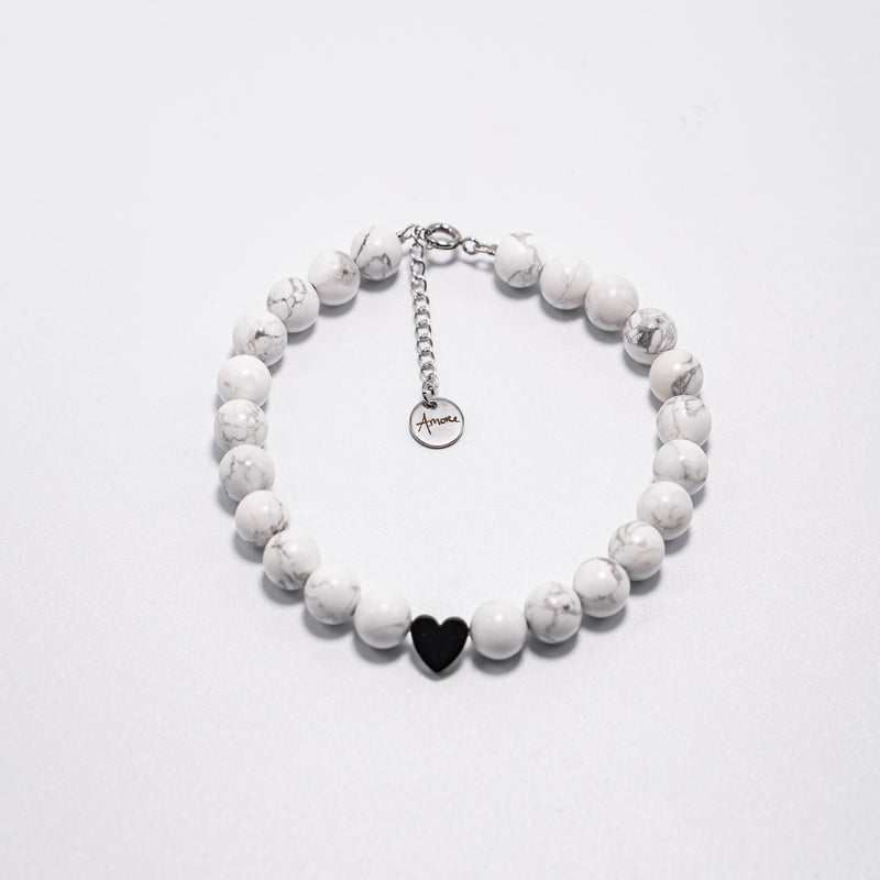 Zapestnica s kamnitimi perlami - haolit, hematit. Ročno sestavljena zapestnica ima na koncu jekleno ketnico. Zato je primerna za skoraj vsa zapestja. Zaključek na verigi je jeklen obesek z gravuro A-more