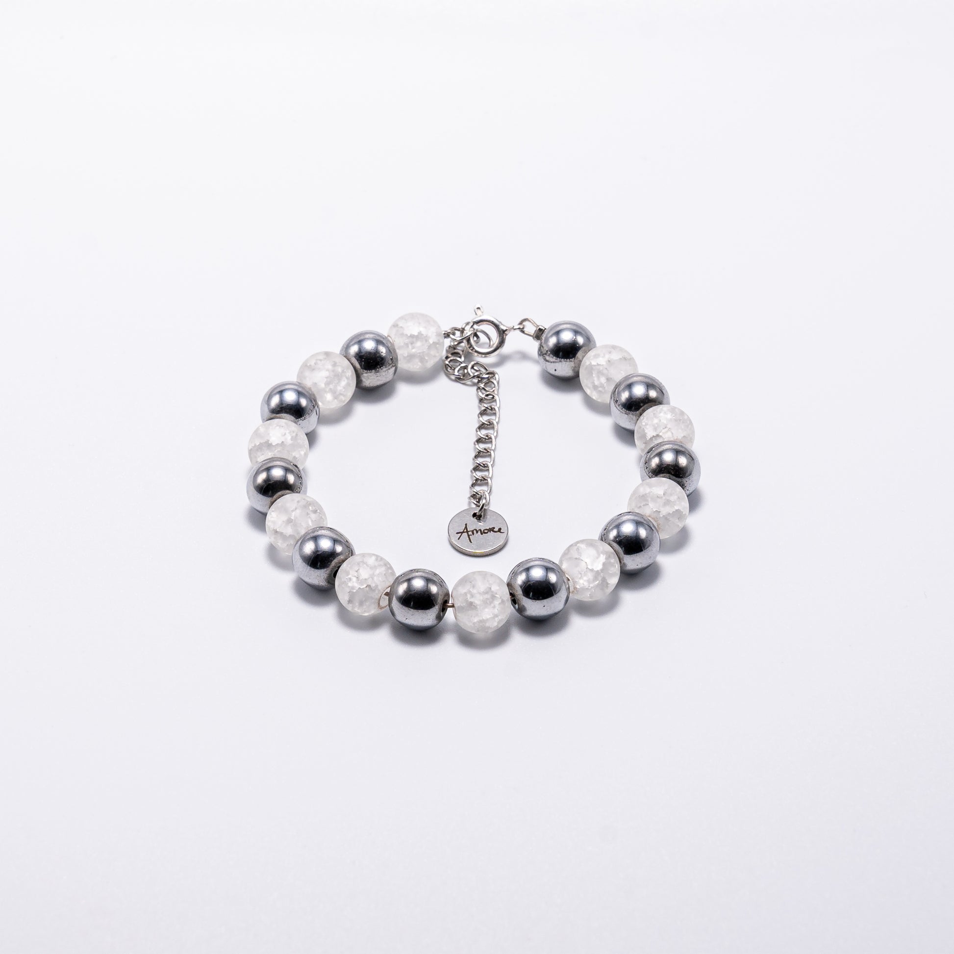 Zapestnica s kamnitimi perlami - gorski kamen, hematit. Ročno sestavljena zapestnica ima na koncu jekleno ketnico. Zato je primerna za skoraj vsa zapestja. Zaključek na verigi je jeklen obesek z gravuro A-more