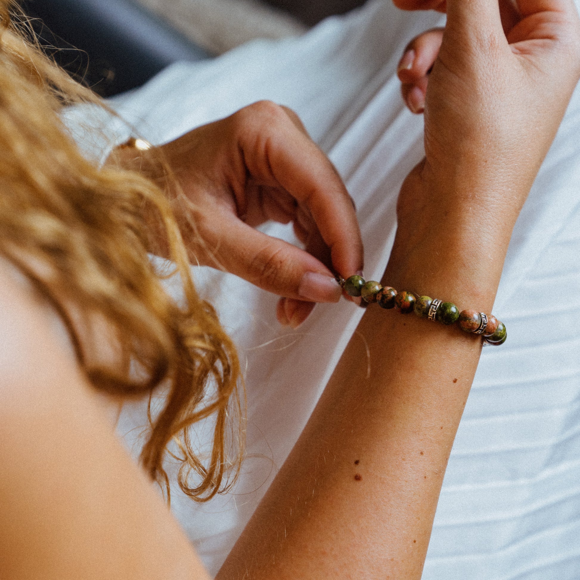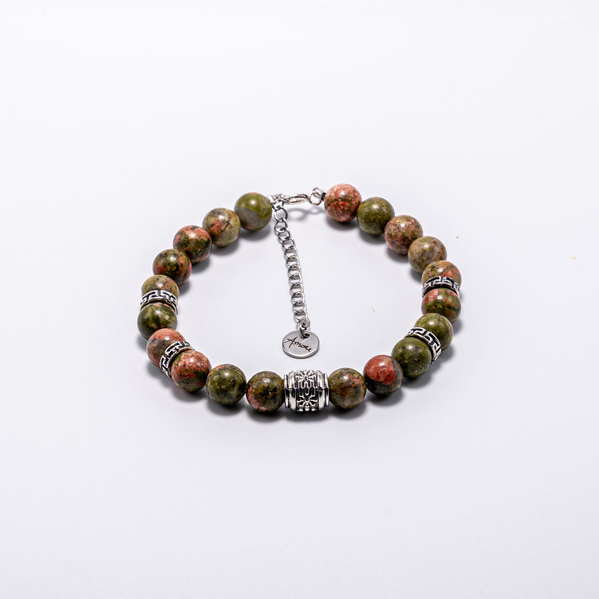 Zapestnica s kamnitimi perlami - unakite jaspis. Ročno sestavljena zapestnica ima na koncu jekleno ketnico. Zato je primerna za skoraj vsa zapestja. Zaključek na verigi je jeklen obesek z gravuro A-more