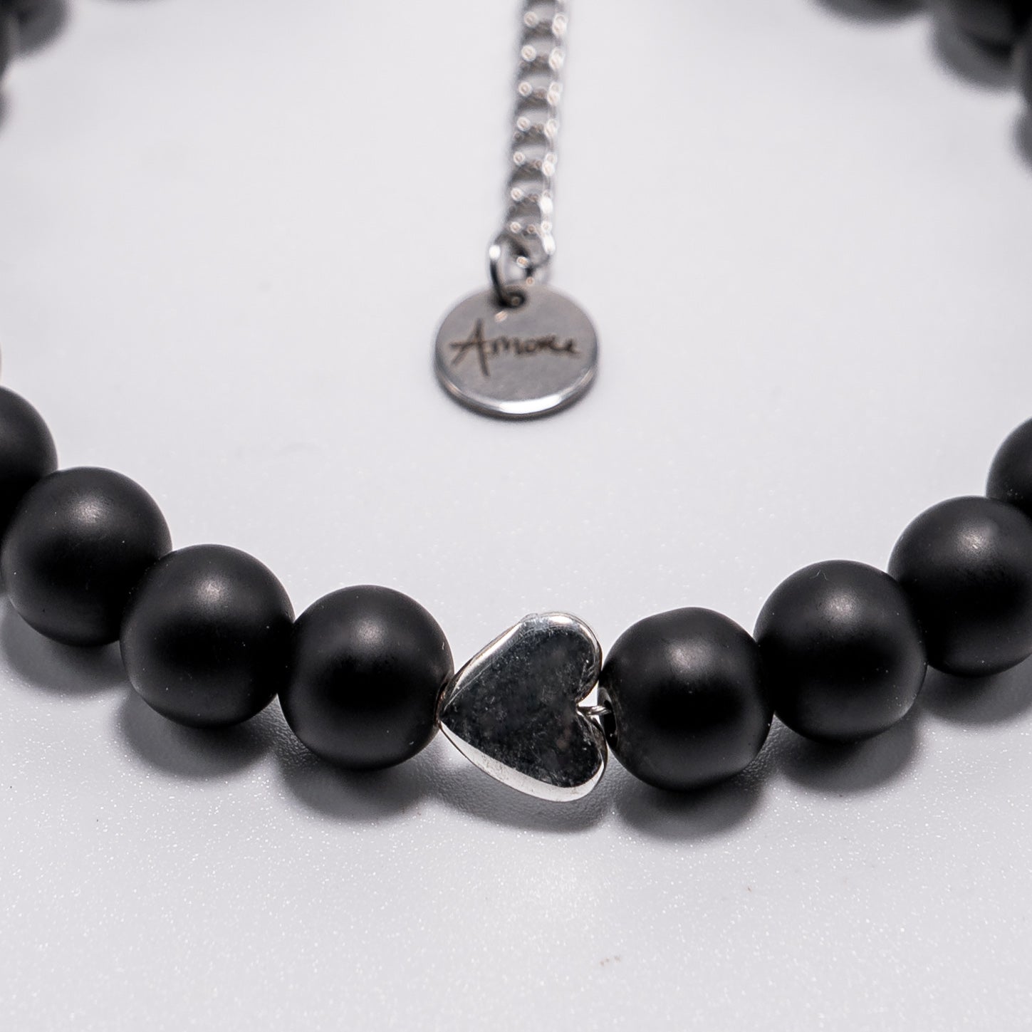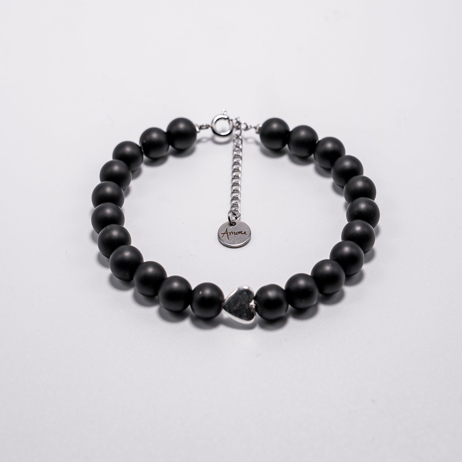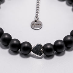 Zapestnica s kamnitimi perlami - oniks. Ročno sestavljena zapestnica ima na koncu jekleno ketnico. Zato je primerna za skoraj vsa zapestja. Zaključek na verigi je jeklen obesek z gravuro A-more