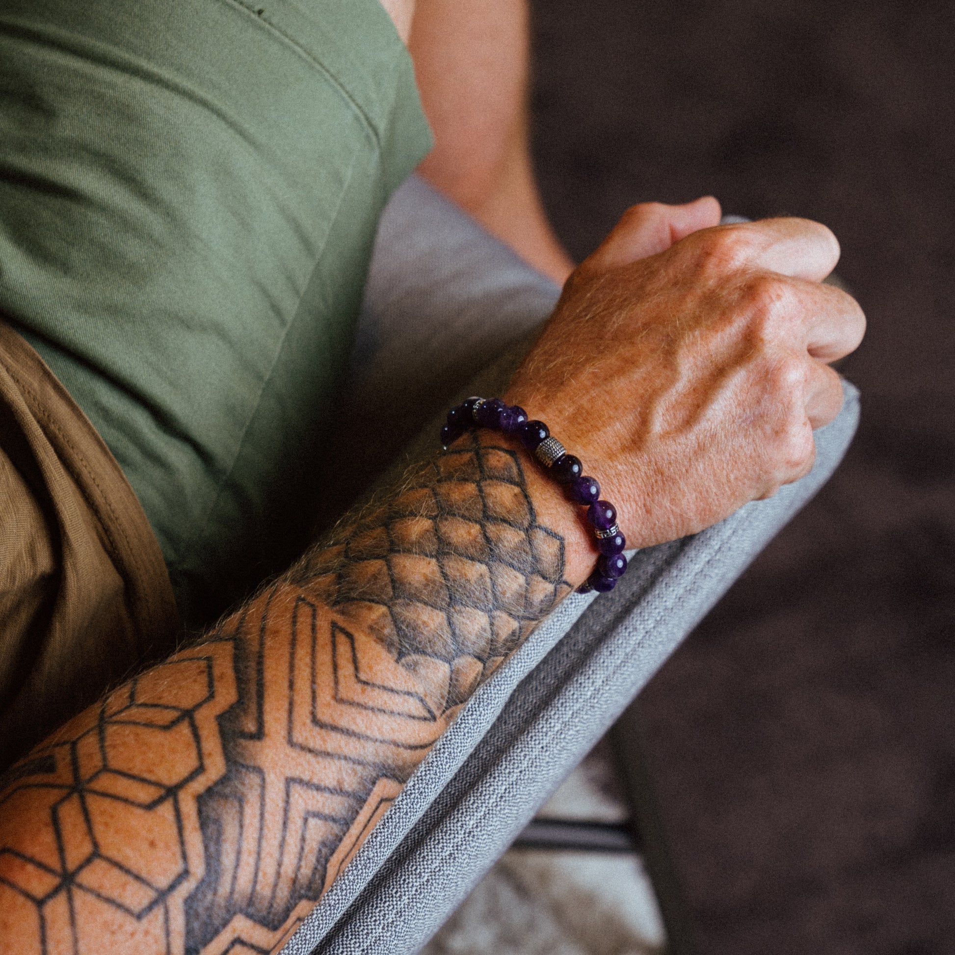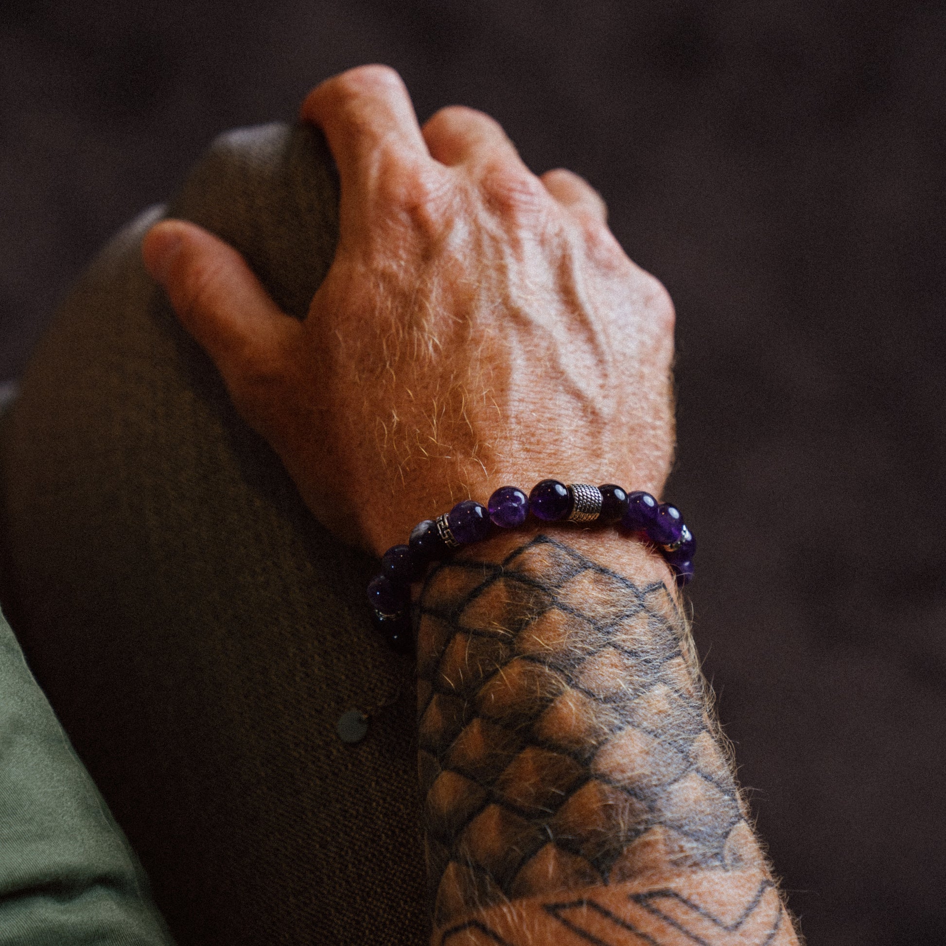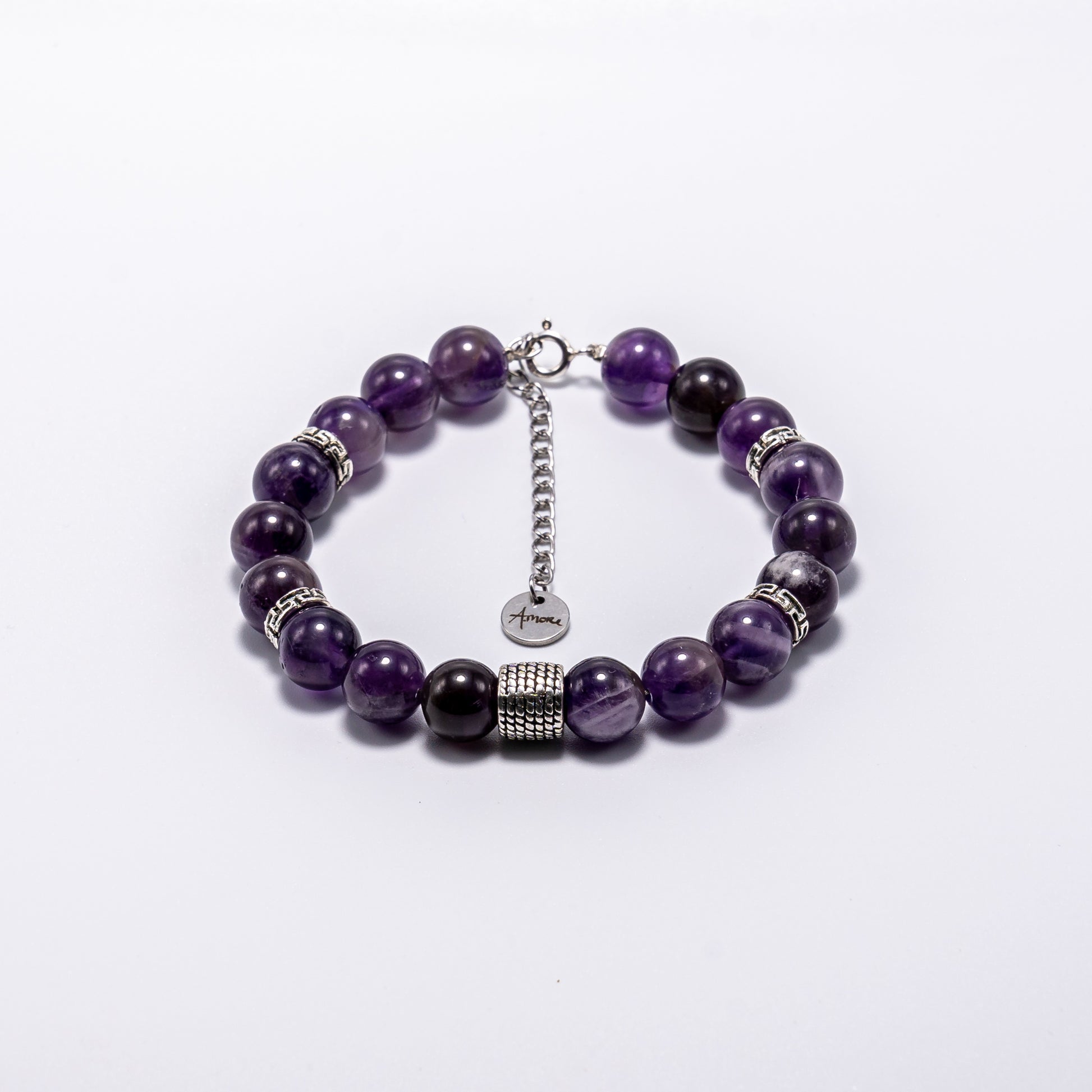 Zapestnica s kamnitimi perlami - gorski ametist. Ročno sestavljena zapestnica ima na koncu jekleno ketnico. Zato je primerna za skoraj vsa zapestja. Zaključek na verigi je jeklen obesek z gravuro A-more