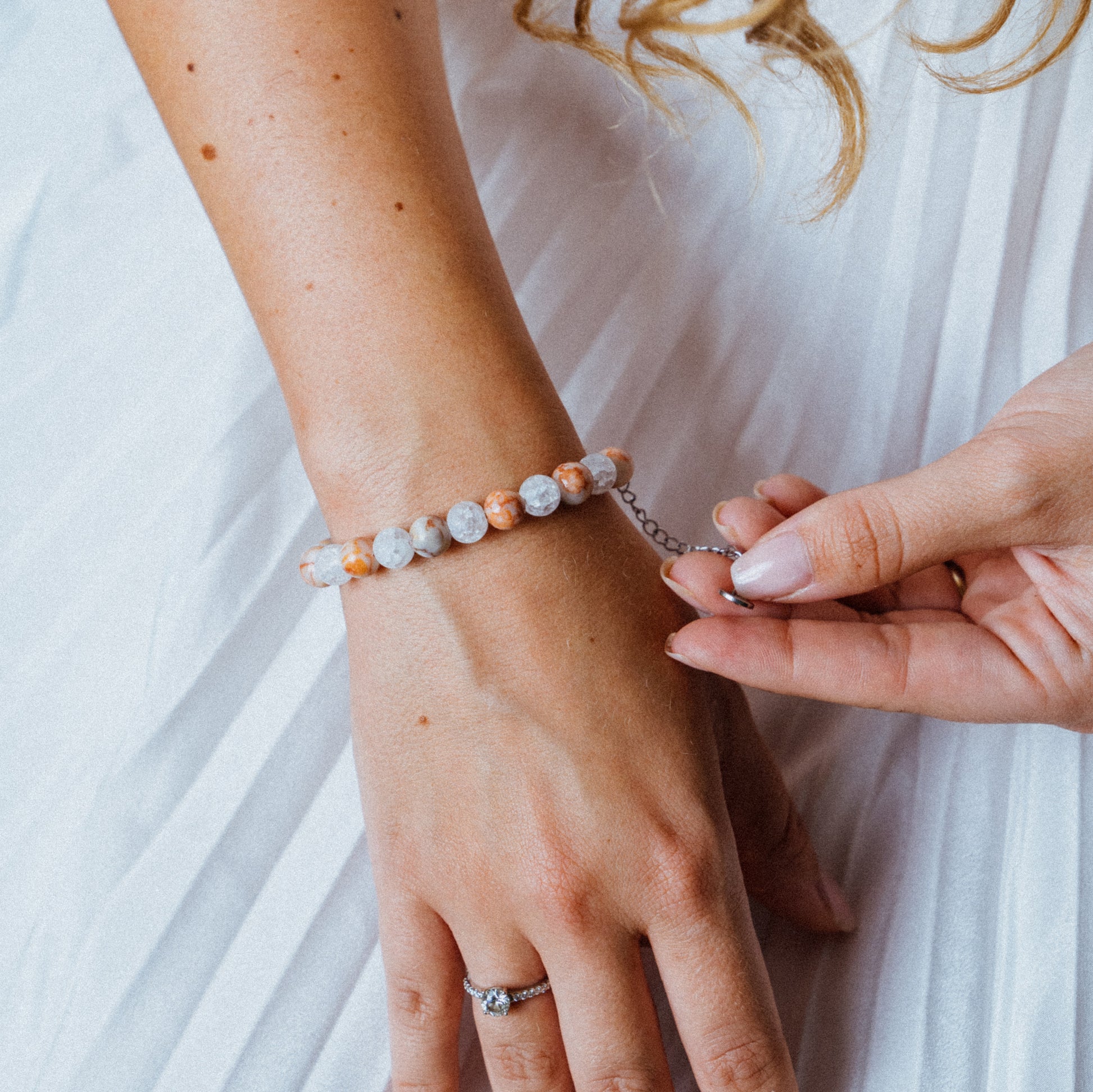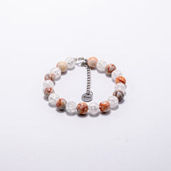 Zapestnica s kamnitimi perlami - gorski kamen, rodonit. Ročno sestavljena zapestnica ima na koncu jekleno ketnico. Zato je primerna za skoraj vsa zapestja. Zaključek na verigi je jeklen obesek z gravuro A-more