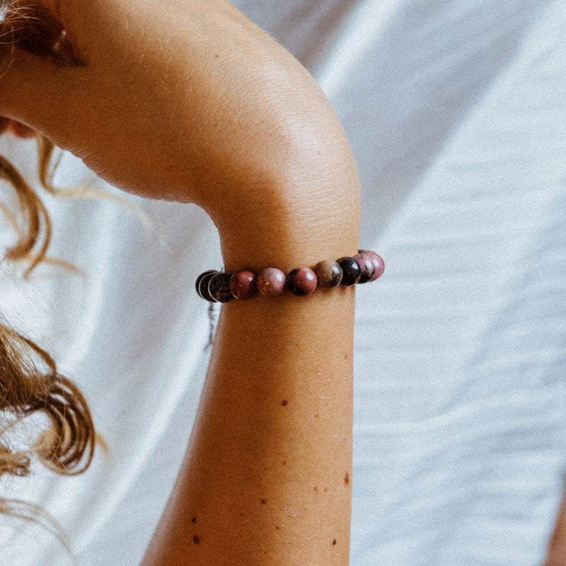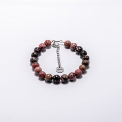 Zapestnica s kamnitimi perlami - rodonit. Ročno sestavljena zapestnica ima na koncu jekleno ketnico. Zato je primerna za skoraj vsa zapestja. Zaključek na verigi je jeklen obesek z gravuro A-more