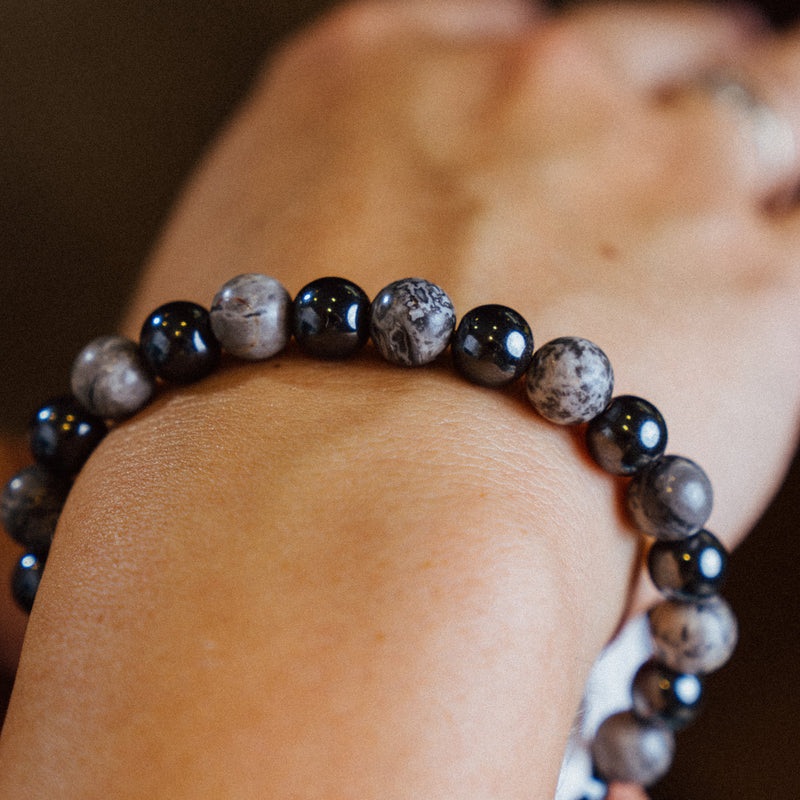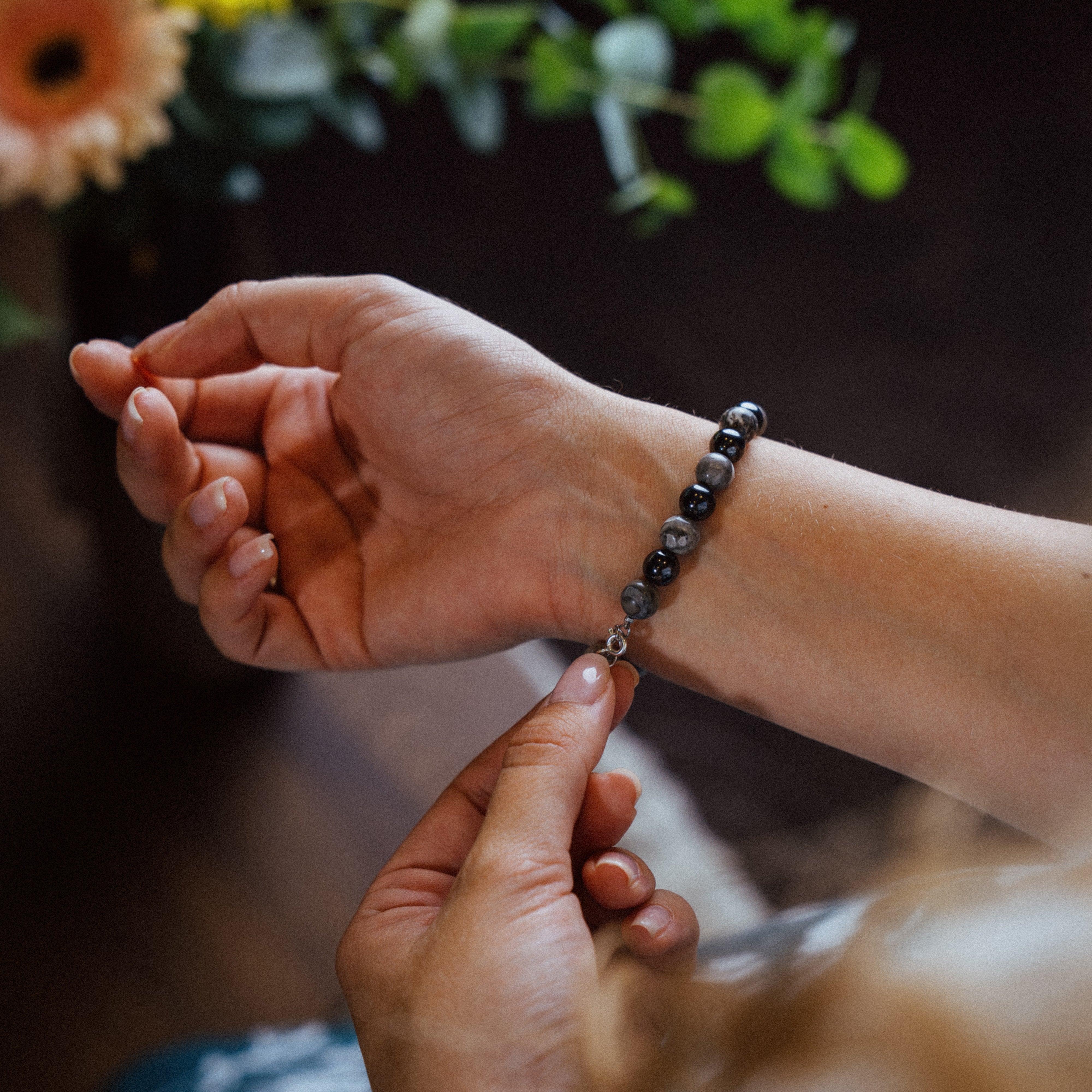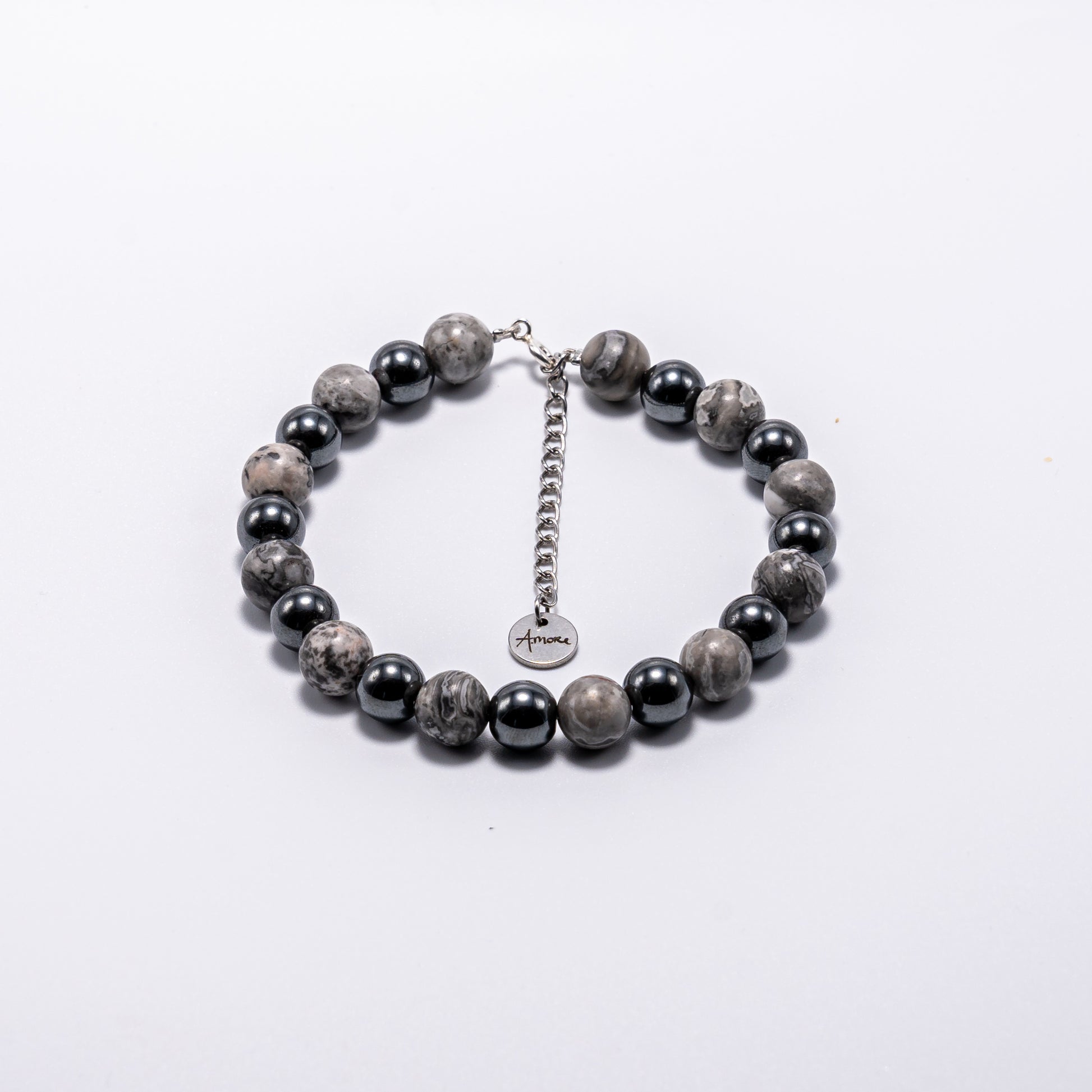 Zapestnica s kamnitimi perlami - hematit, jaspis. Ročno sestavljena zapestnica ima na koncu jekleno ketnico. Zato je primerna za skoraj vsa zapestja. Zaključek na verigi je jeklen obesek z gravuro A-more