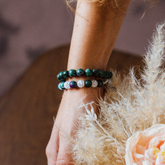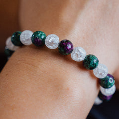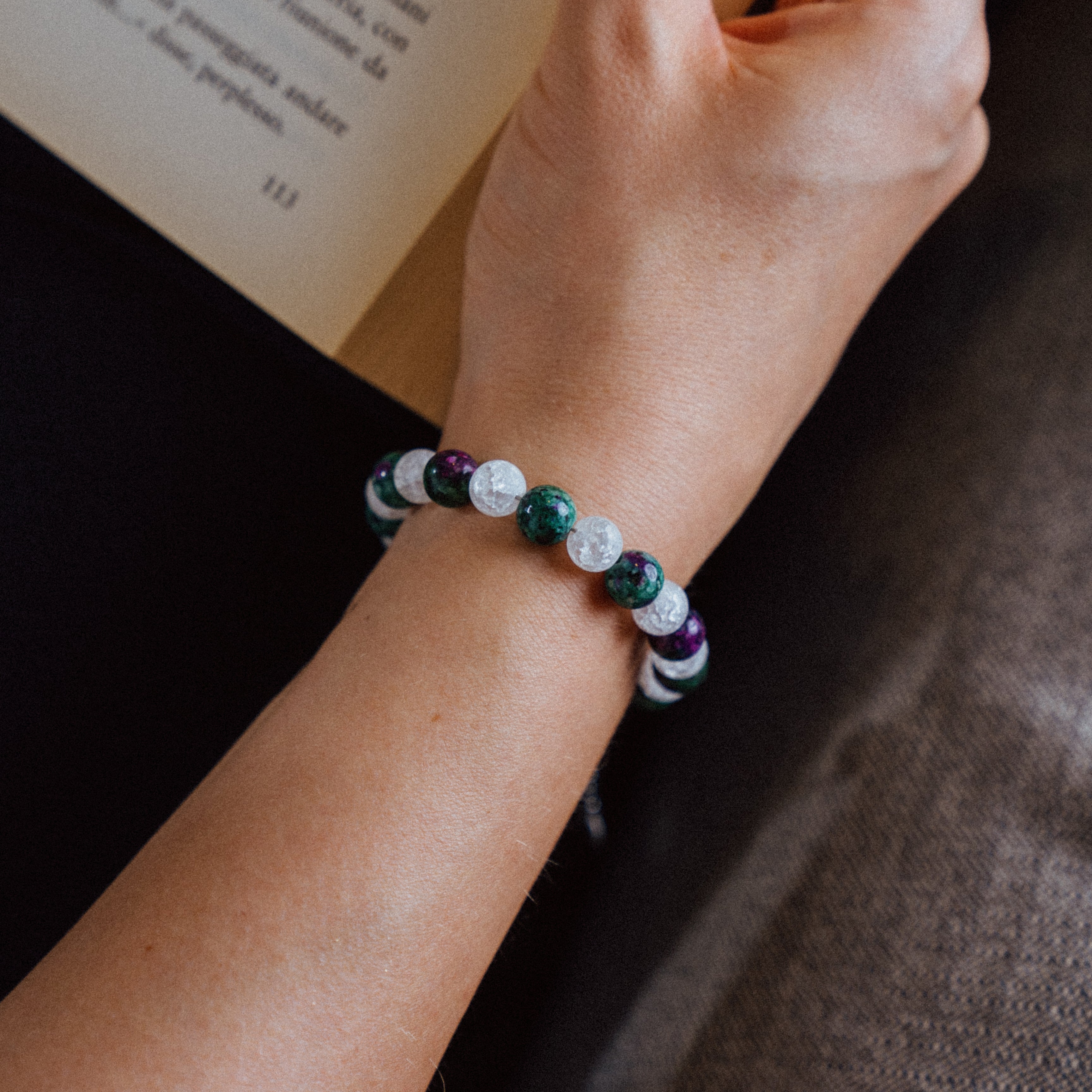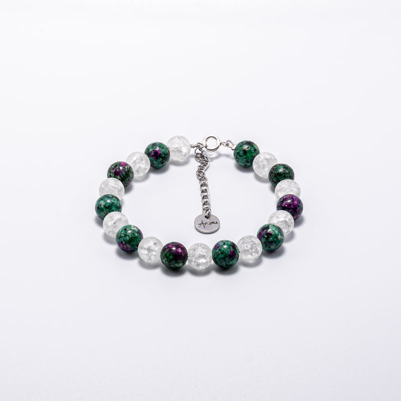Zapestnica s kamnitimi perlami - gorski kamen, rubinzois. Ročno sestavljena zapestnica ima na koncu jekleno ketnico. Zato je primerna za skoraj vsa zapestja. Zaključek na verigi je jeklen obesek z gravuro A-more