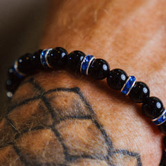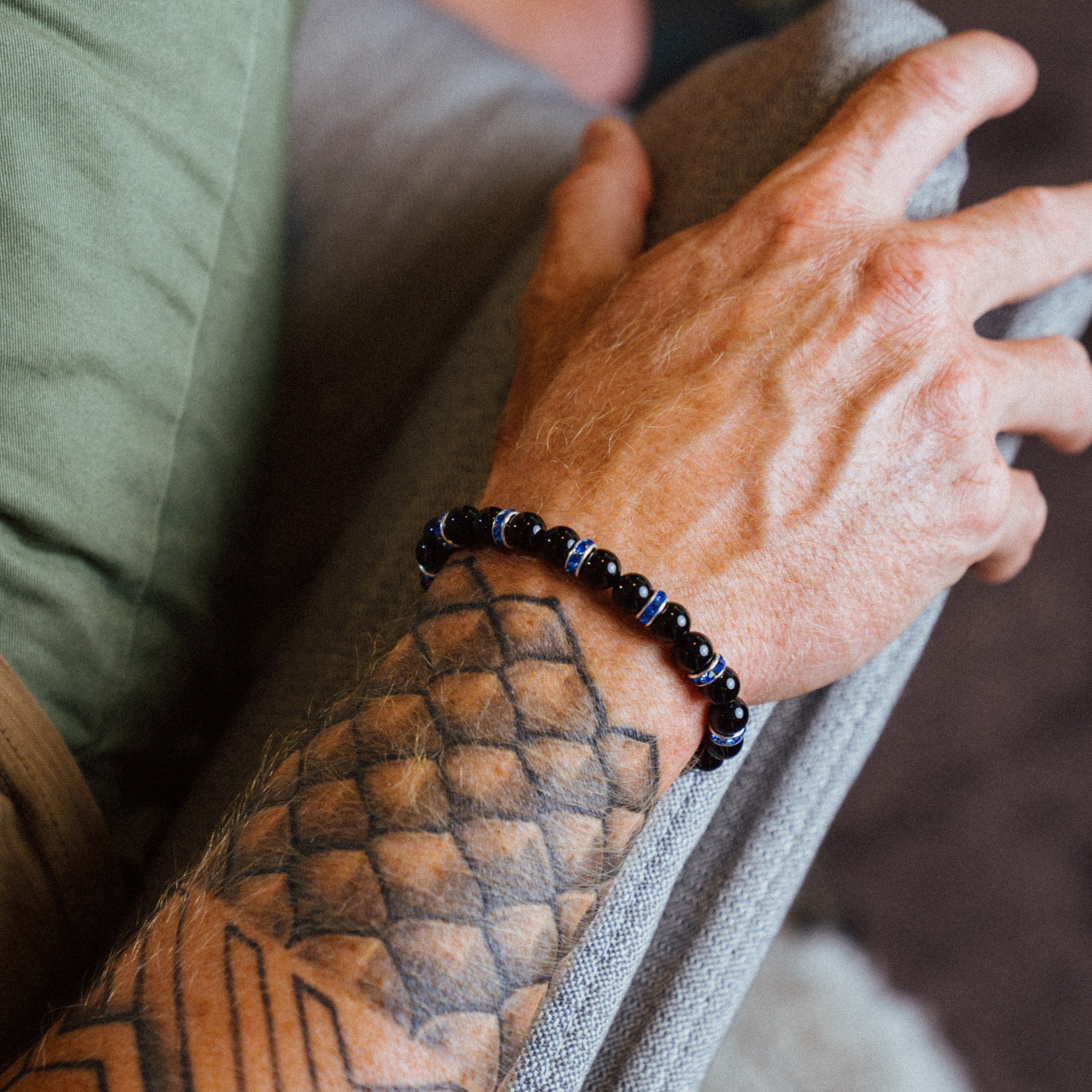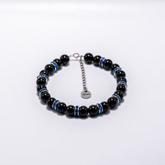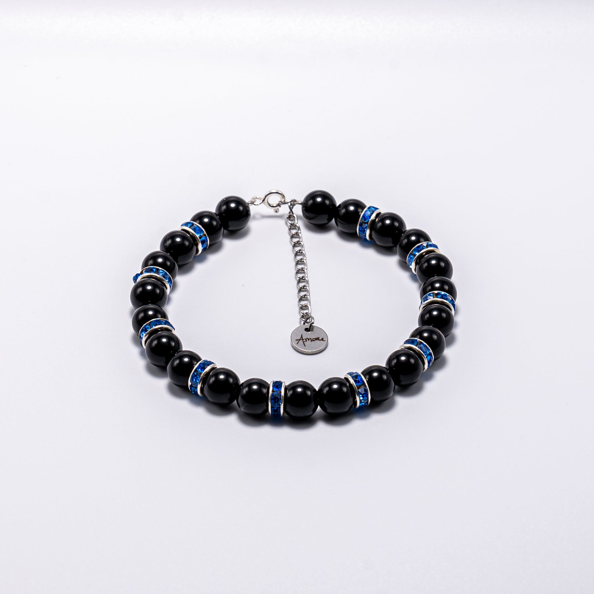 Zapestnica s kamnitimi perlami - oniks. Ročno sestavljena zapestnica ima na koncu jekleno ketnico. Zato je primerna za skoraj vsa zapestja. Zaključek na verigi je jeklen obesek z gravuro A-more