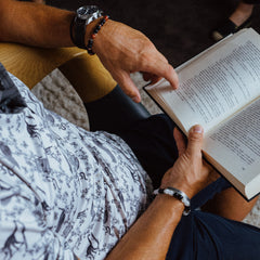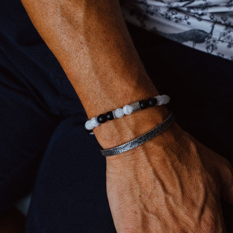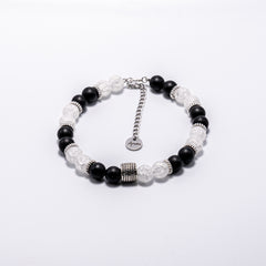 Zapestnica s kamnitimi perlami - oniks, gorski kamen. Ročno sestavljena zapestnica ima na koncu jekleno ketnico. Zato je primerna za skoraj vsa zapestja. Zaključek na verigi je jeklen obesek z gravuro A-more