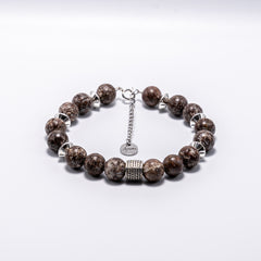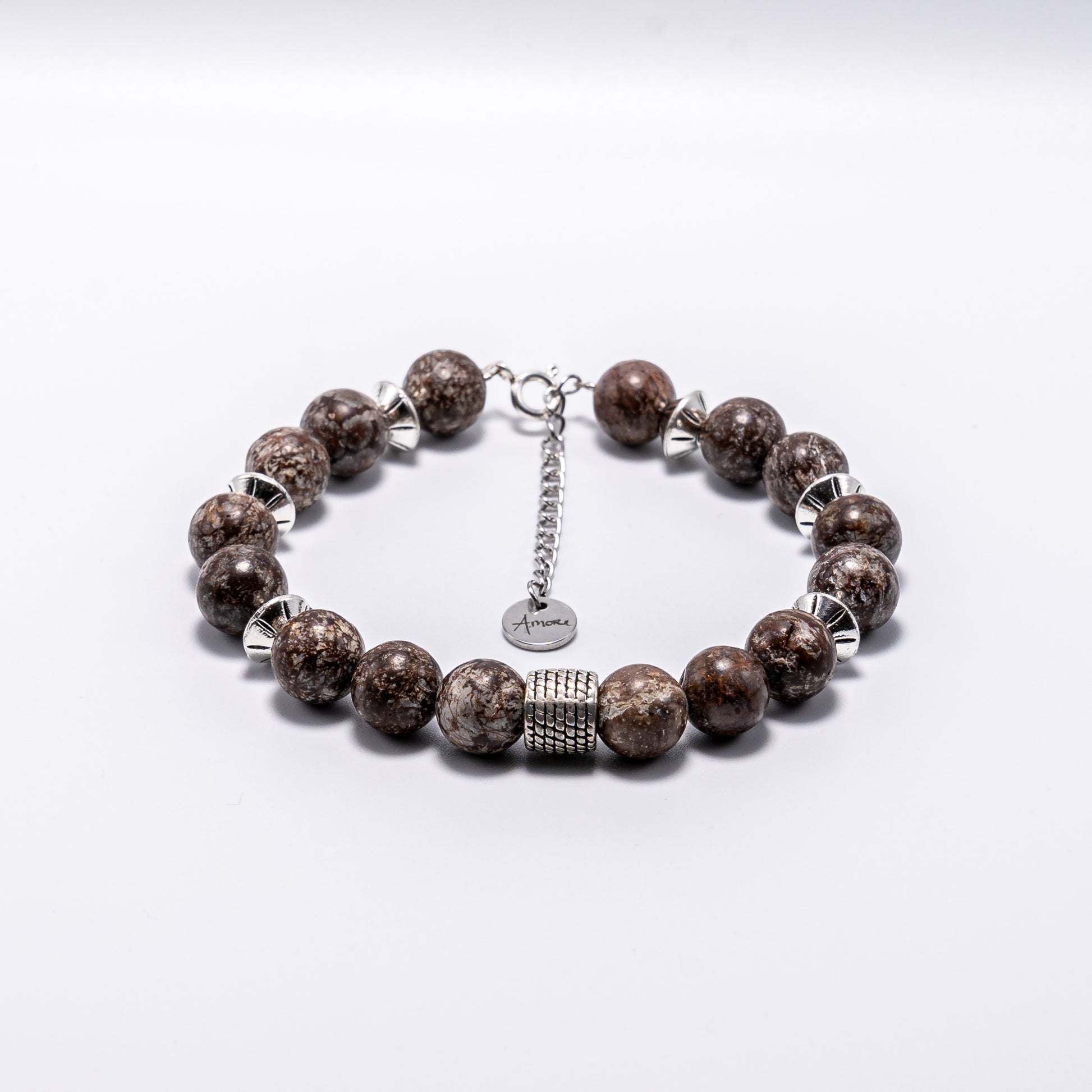 Zapestnica s kamnitimi perlami - jaspis. Ročno sestavljena zapestnica ima na koncu jekleno ketnico. Zato je primerna za skoraj vsa zapestja. Zaključek na verigi je jeklen obesek z gravuro A-more